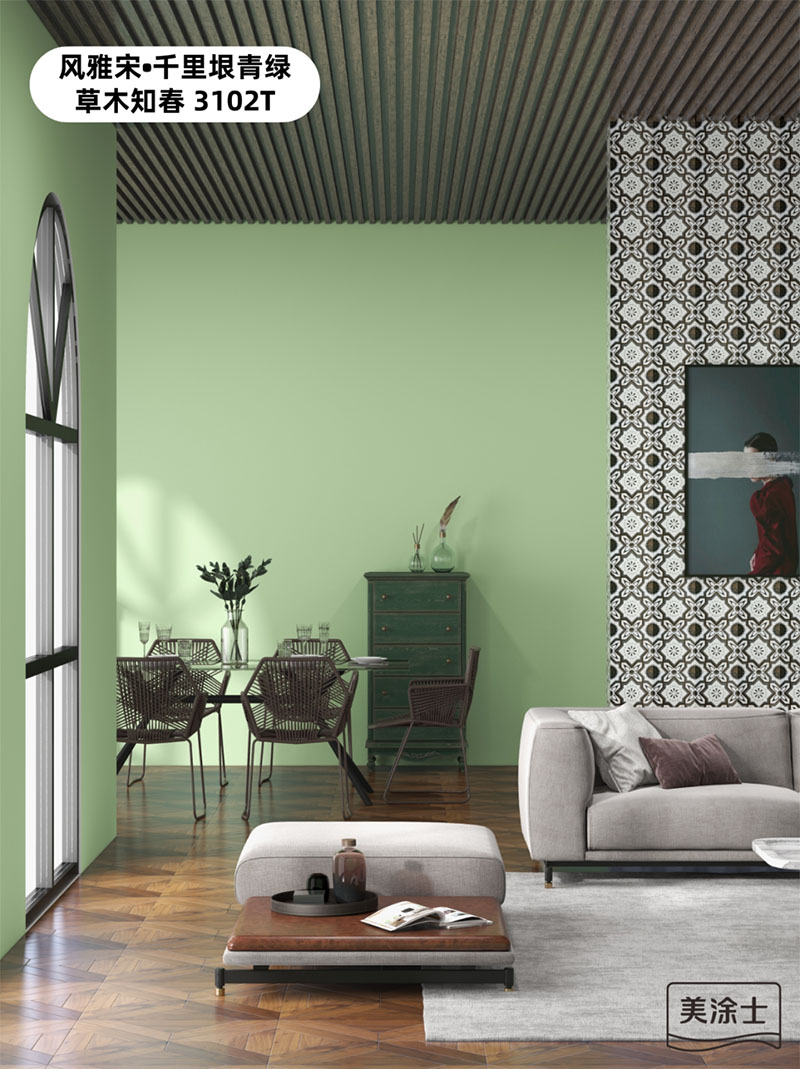 w66最给力国潮色草木知春3102T,弱化了复古绿的陈旧感,强化了空间的时髦感,与灰白软装的搭配,一明一暗的对比,一冷一暖的融合,奢华的质感与复古的气息碰撞,勾勒出低调的高级时尚感,让空间的气场和颜值达到峰值。